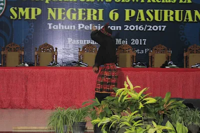 FIQO - Alhamdulillah, SMP Negeri 6 Kota Pasuruan bisa menyelenggarakan Wisuda UPT SMP Negeri 6 Kota Pasuruan tahun Pelajaran 2016/2017 di Gedung Gradika Bhakti Praja Kota Pasuruan pada tanggal 18 Mei 2017. Pada Wisuda ini diadakan juga Pentas Seni dari siswa-siswi SMP Negeri 6 Kota Pasuruan diantaranya Menyanyi, Pencak silat, Pembacaan Puisi, dan lainnya. Dengan diawali dari pentas seni, tepat pukul 09.00 Wib diadakan prosesi wisudawan SMP Negeri 6 Kota Pasuruan dan berakhir tepat pukul 13.00 Wib.